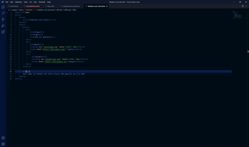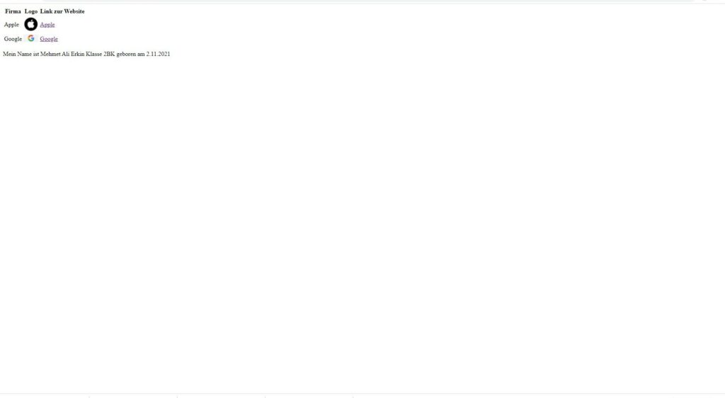 Im Wintersemester bestand unser Arbeitsauftrag darin, eine HTML-Tabelle zu erstellen, die die Firmen Apple und Google mit ihren Logos und Links zu ihren offiziellen Websites zeigt. Die Tabelle sollte drei Spalten enthalten: „Firma“, „Logo“ und „Link zur Website“. Die Logos wurden als Bilder eingebunden und auf eine Breite von 40 Pixeln festgelegt. Die Links zu den Websites wurden so programmiert, dass sie sich beim Klicken in einem neuen Fenster öffnen (mittels target="_blank").