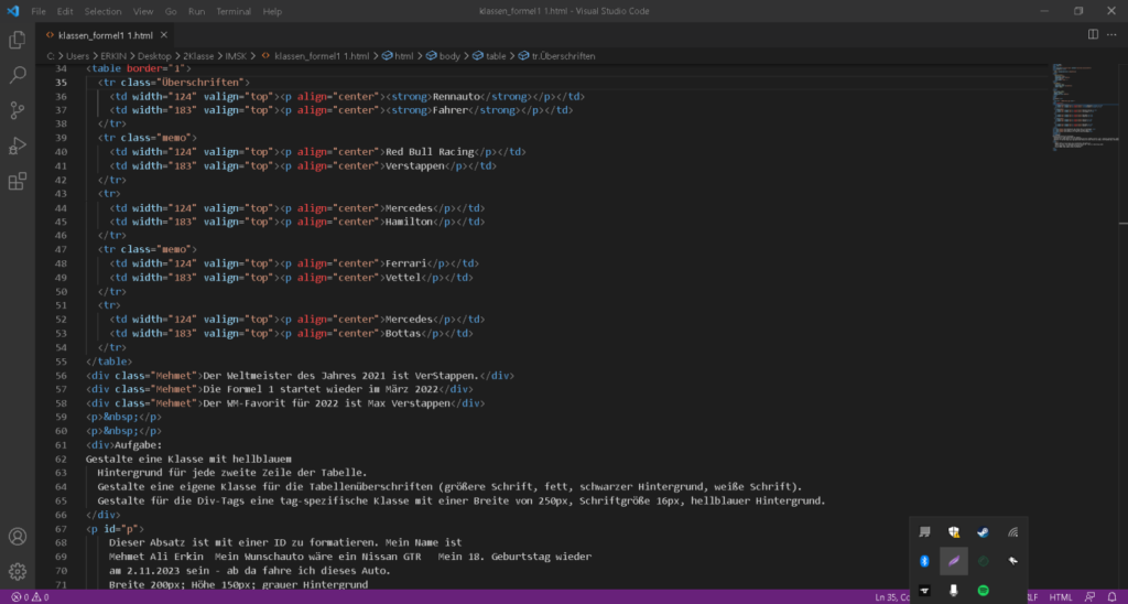 Anschließend haben wir uns intensiv mit CSS beschäftigt. CSS ist die Sprache, mit der man das Aussehen und die Gestaltung einer Webseite steuern kann. Im Unterricht haben wir gelernt, wie man mit CSS Schriftarten, Schriftgrößen und Farben verändert, Hintergründe gestaltet und Abstände sowie Rahmen einfügt, um die Inhalte übersichtlich zu strukturieren. Außerdem konnten wir die Größe von Bildern anpassen, damit sie auf verschiedenen Geräten immer gut dargestellt werden.