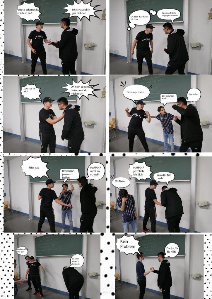 Bei dieser Aufgabe habe ich gemeinsam mit meiner Gruppe Fotos gemacht und sie anschließend in Photoshop eingefügt. Danach habe ich passende Sprechblasen hinzugefügt und mit Text versehen. Außerdem habe ich einen passenden Hintergrund ausgewählt, um die Szene stimmig zu gestalten.